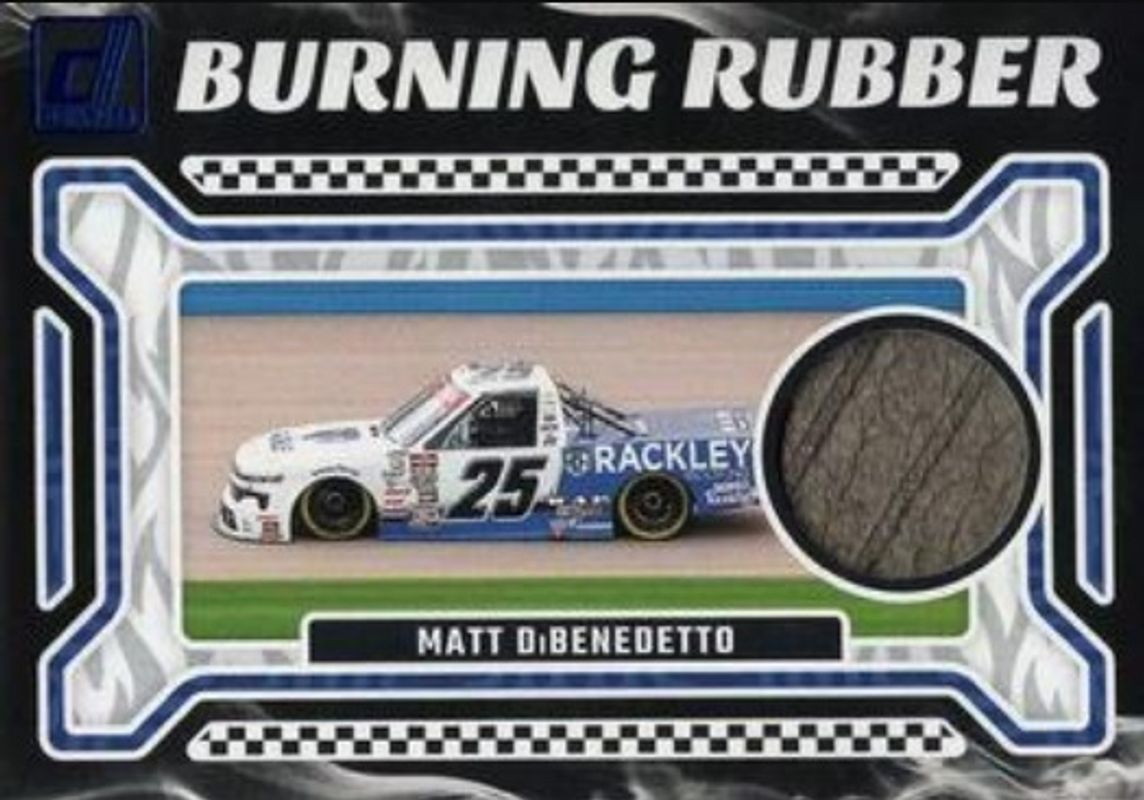 The Matt DiBenedetto 2024 Donruss NASCAR #BRM-MD Burning Rubber Materials - Blue card is 1 of 34 Matt DiBenedetto's card variations in the 2024 Donruss NASCAR set being tracked by Sports Card Investor, including Base, Optic, Optic Black Pandora, Optic Blue Velocity, and Optic Holo.