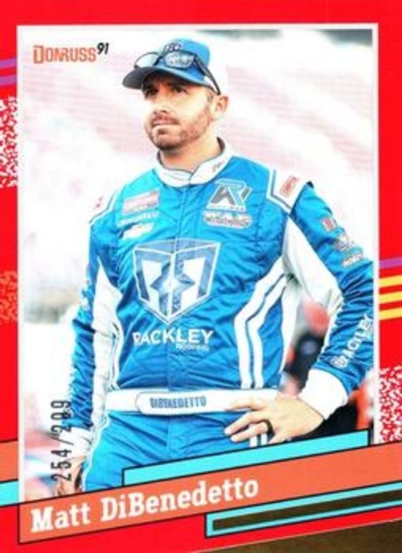 The Matt DiBenedetto 2024 Donruss NASCAR #152 Red /299 card is 1 of 34 Matt DiBenedetto's card variations in the 2024 Donruss NASCAR set being tracked by Sports Card Investor, including Base, Optic, Optic Black Pandora, Optic Blue Velocity, and Optic Holo.