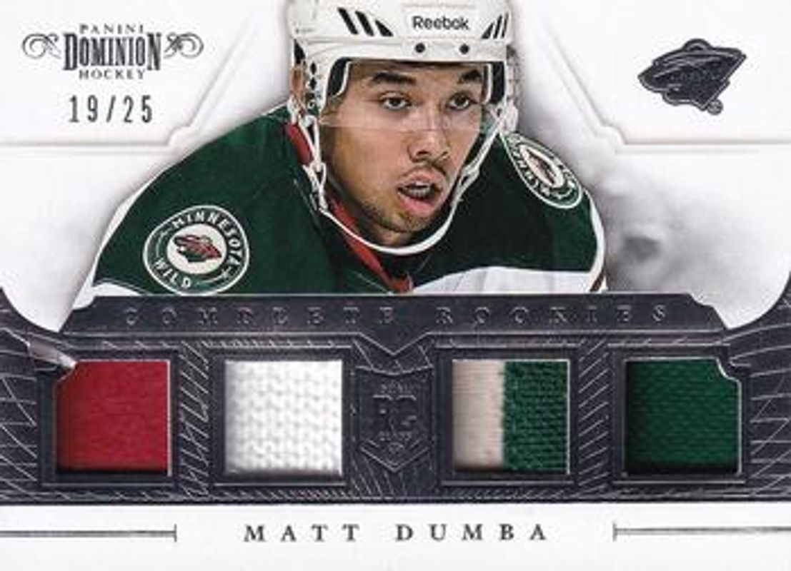 The Matt Dumba 2013 Panini Rookie Anthology #CR-MDB 2013 Panini Dominion Update: Complete Rookies Jerseys /25 card is 1 of 34 Matt Dumba's card variations in the 2013 Panini Rookie Anthology set being tracked by Sports Card Investor, including Purple /1, 2013 Panini Update, 2013 Panini Update:, 2013 Panini Update: Rookie Autographs, and 2013 Panini Update: Rookie Autographs Spring Expo Cracked Ice - Black.