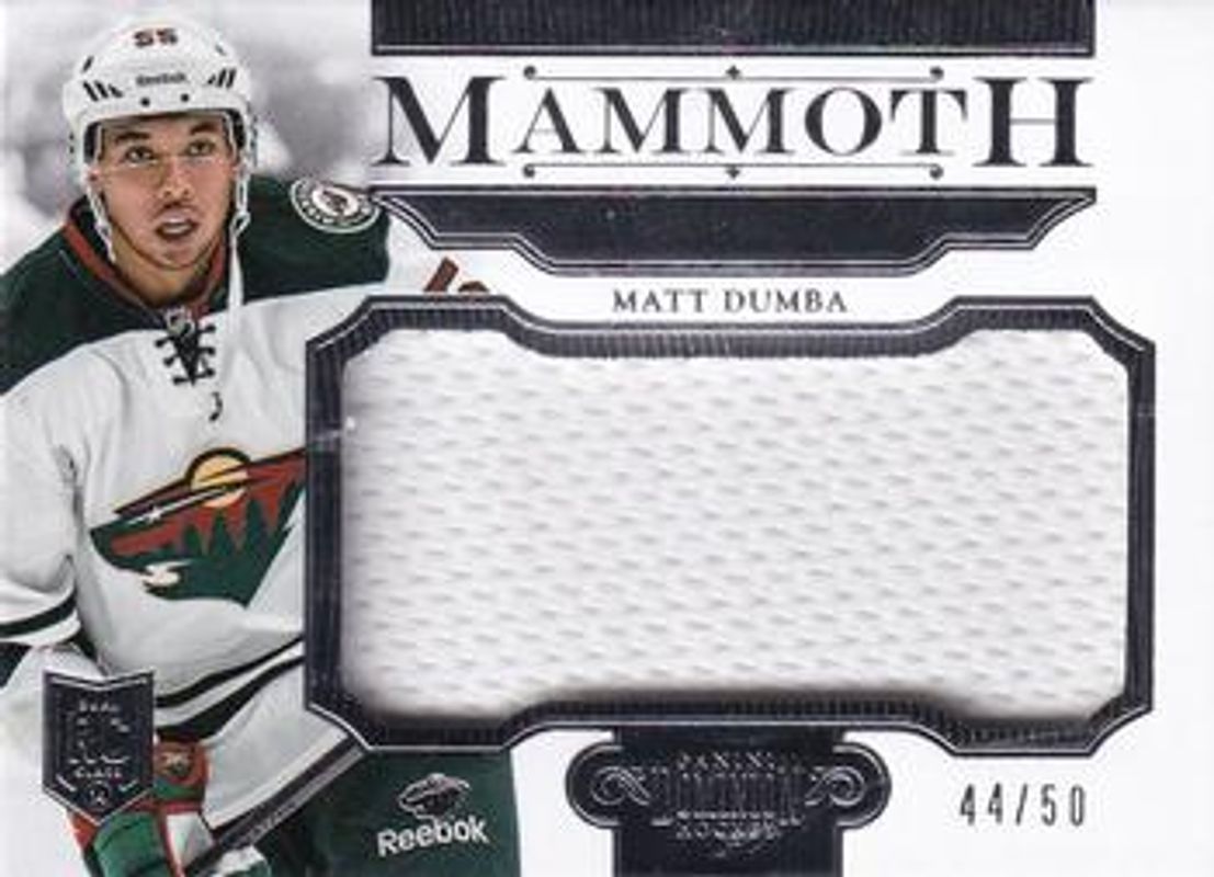 The Matt Dumba 2013 Panini Rookie Anthology #M-MDB 2013 Panini Dominion Update: Mammoth Jersey /50 card is 1 of 34 Matt Dumba's card variations in the 2013 Panini Rookie Anthology set being tracked by Sports Card Investor, including Purple /1, 2013 Panini Update, 2013 Panini Update:, 2013 Panini Update: Rookie Autographs, and 2013 Panini Update: Rookie Autographs Spring Expo Cracked Ice - Black.