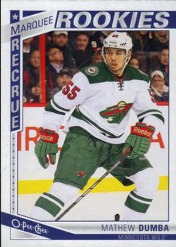 The Matt Dumba 2013 Upper Deck #617 2013 O-Pee-Chee Update Rookie card is 1 of 15 Matt Dumba's card variations in the 2013 Upper Deck set being tracked by Sports Card Investor, including Young Guns Base, Young Guns - Acetate, Young Guns - Jumbo, Young Guns - UD Exclusives /100, and Young Guns - UD High Gloss /10.