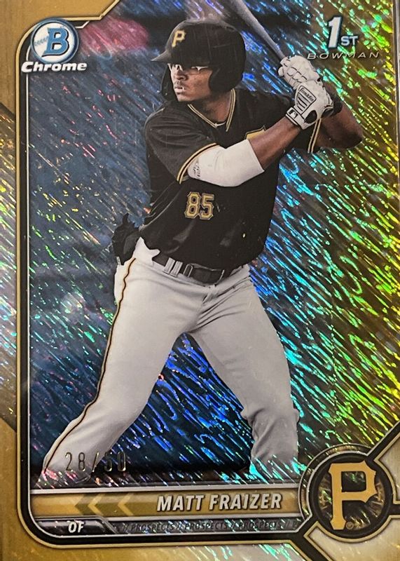 The Matt Fraizer 2022 Bowman #BCP-91 Chrome Prospects - Gold Shimmer Refractor /50 (1st) card in Raw condition has not changed in price in the last 30 days and was last sold for $3.15 .