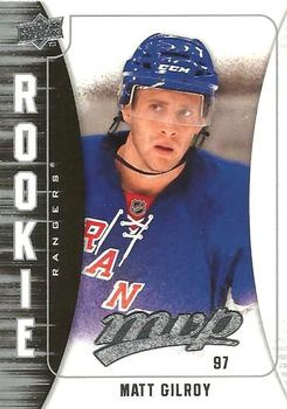 The Matt Gilroy 2009 Upper Deck MVP #378 Base Rookie card is 1 of 3 Matt Gilroy's card variations in the 2009 Upper Deck MVP set being tracked by Sports Card Investor, including Gold Script /100, and Super Script /25.