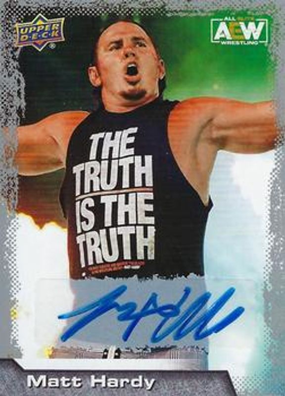 The Matt Hardy 2022 Upper Deck AEW #41 Autographs card is 1 of 28 Matt Hardy's card variations in the 2022 Upper Deck AEW set being tracked by Sports Card Investor, including Base, Gold, Pyro, Silver Foil, and Green Pyro /399.