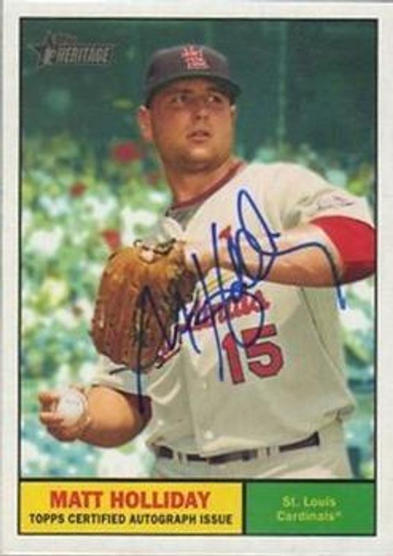 The Matt Holliday 2010 Topps Heritage #ROAMH Real One Autographs card is 1 of 11 Matt Holliday's card variations in the 2010 Topps Heritage set being tracked by Sports Card Investor, including Base, Chrome /1961, Chrome Refractor /561, Chrome Black Refractor /61, and Real One Autographs.