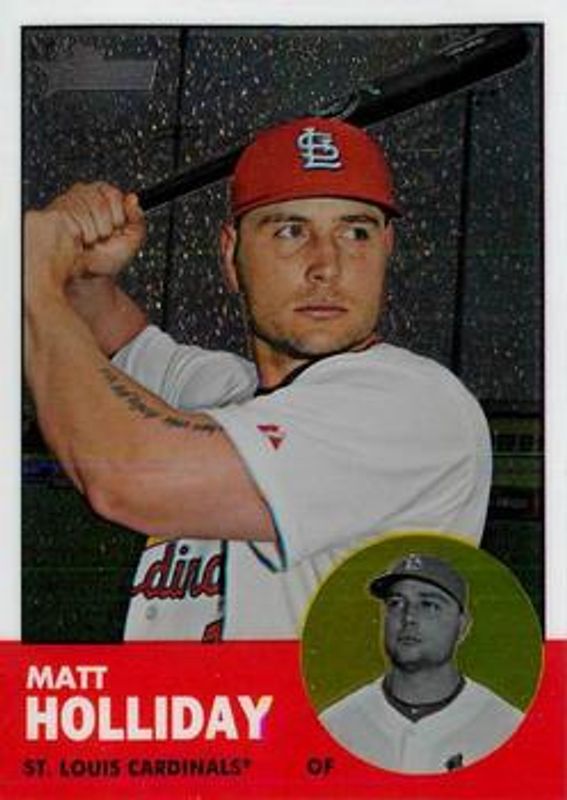 The Matt Holliday 2012 Topps Heritage #HP81 Chrome /1963 card is 1 of 9 Matt Holliday's card variations in the 2012 Topps Heritage set being tracked by Sports Card Investor, including Base, Black, Target Red Border, Chrome Refractor /563, and Chrome Black Refractor /63.