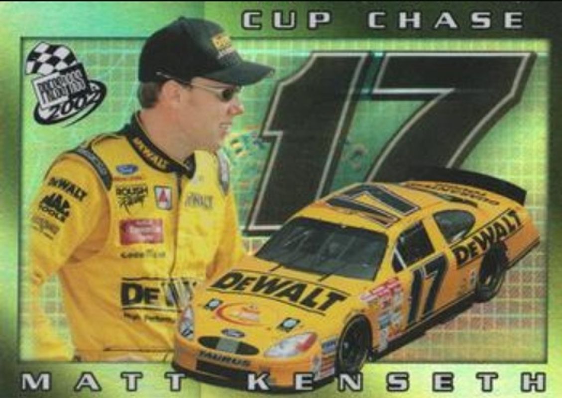 The Matt Kenseth 2002 Press Pass #CCR-7 Cup Chase card is 1 of 8 Matt Kenseth's card variations in the 2002 Press Pass set being tracked by Sports Card Investor, including Base, Platinum, Autographs, Vintage, and Cup Chase Prizes /350.