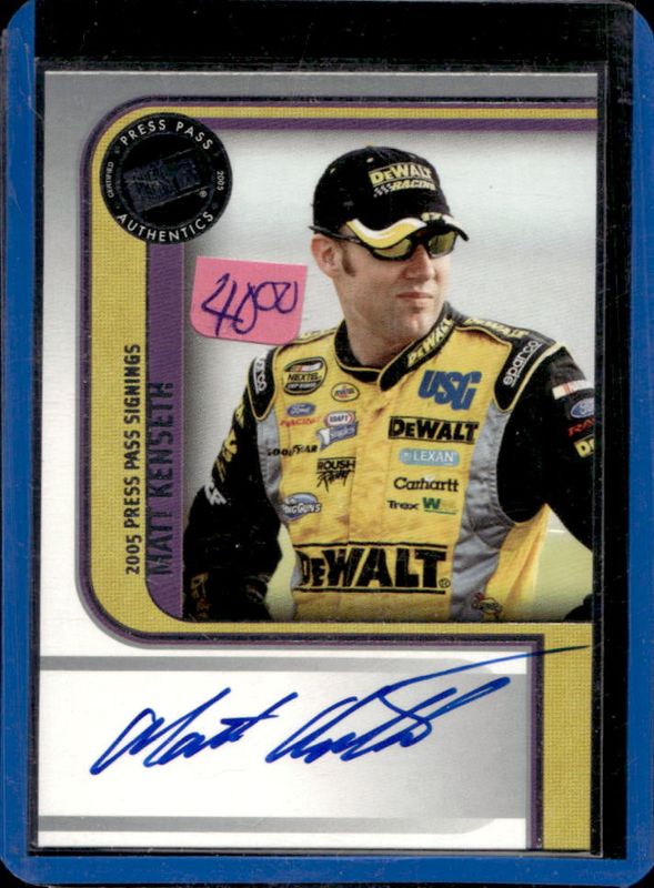 The Matt Kenseth 2005 Press Pass Autographs card is 1 of 22 Matt Kenseth's card variations in the 2005 Press Pass set being tracked by Sports Card Investor, including #12 Base, #74 Base, #74 Beckett Samples, #12 Beckett Samples, and #P74 Platinum /100.