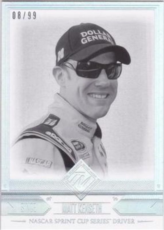 The Matt Kenseth 2014 Press Pass Total Memorabilia #14 Black & White /99 card is 1 of 20 Matt Kenseth's card variations in the 2014 Press Pass Total Memorabilia set being tracked by Sports Card Investor, including Base, Red, Gold /175, Total Memorabilia Silver Single /275, and Total Memorabilia Gold Dual /150.