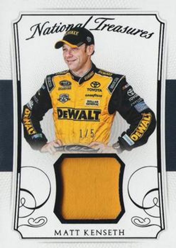 The Matt Kenseth 2016 National Treasures NASCAR #FM-MK Firesuit Materials Black /5 card is 1 of 144 Matt Kenseth's card variations in the 2016 National Treasures NASCAR set being tracked by Sports Card Investor, including #7 Base /25, #32 Base /25, #32 Century Silver /20, #7 Century Silver /20, and #7 Century Gold /15.