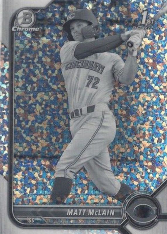 This card is 1 of 25 Matt McLain's card variations in the 2022 Bowman Chrome set being tracked by Sports Card Investor, including Prospects (1st), Prospects - Shimmer Refractor (1st), Prospects - Refractor /499 (1st), Prospects - Speckle Refractor /299 (1st), and Prospects - Purple Refractor /250 (1st).