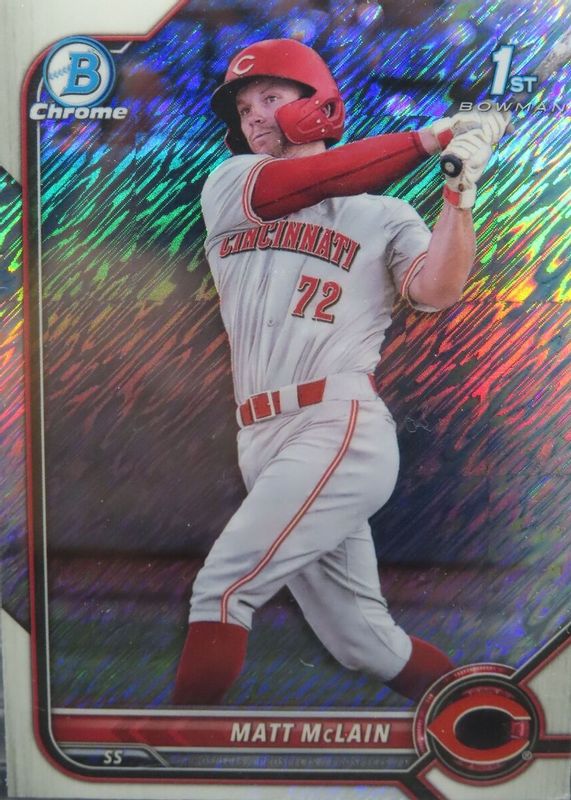 The Matt McLain 2022 Bowman Chrome #BCP-245 Prospects - Shimmer Refractor (1st) card in Raw condition has moved up $6.40 (+322%) in the last 30 days and was last sold for $8.39 .