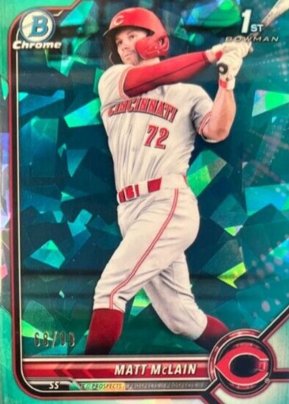 This card is 1 of 7 Matt McLain's card variations in the 2022 Bowman Chrome Sapphire Edition set being tracked by Sports Card Investor, including Prospects (1st), Prospects - Orange /75 (1st), Prospects - Yellow /50 (1st), Prospects - Purple /25 (1st), and Prospects - Red /5 (1st).