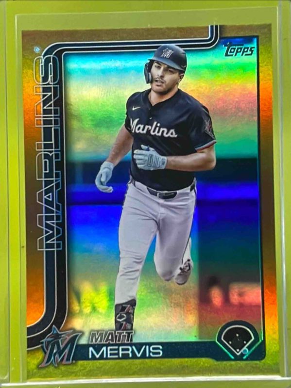 The Matt Mervis 2025 Topps Update #US68 Gold Rainbow Foil /50 card is 1 of 52 Matt Mervis' card variations in the 2025 Topps Update set being tracked by Sports Card Investor, including Base, Aqua Holo Foil, Aqua Rainbow Foil, Diamante Foil, and Holiday.