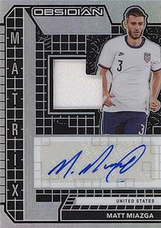 The Matt Miazga 2020 Obsidian #MM-MMI Matrix Material Autographs /20 card is 1 of 12 Matt Miazga's card variations in the 2020 Obsidian set being tracked by Sports Card Investor, including Lightning Strike Autographs - Red Flood /44, Lightning Strike Autographs /20, Lightning Strike Autographs - Purple /15, Matrix Material Autographs - Purple /15, and Lightning Strike Autographs - Orange /10.