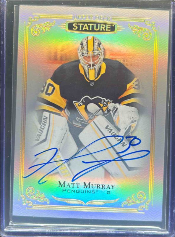 The Matt Murray 2020 Upper Deck Stature #69 2019 Upper Deck Stature Update: Autographs /199 card is 1 of 7 Matt Murray's card variations in the 2020 Upper Deck Stature set being tracked by Sports Card Investor, including 2019 Upper Deck Stature Update: Autographs - Green /65, 2019 Upper Deck Stature Update: Autographs - Red /35, 2019 Upper Deck Stature Update: Autographs - Blue /10, 2019 Upper Deck Stature Update: Portrait Variant Autographs Patch /9, and 2019 Upper Deck Stature Update: Portrait Variant Autographs Patch - Red /3.