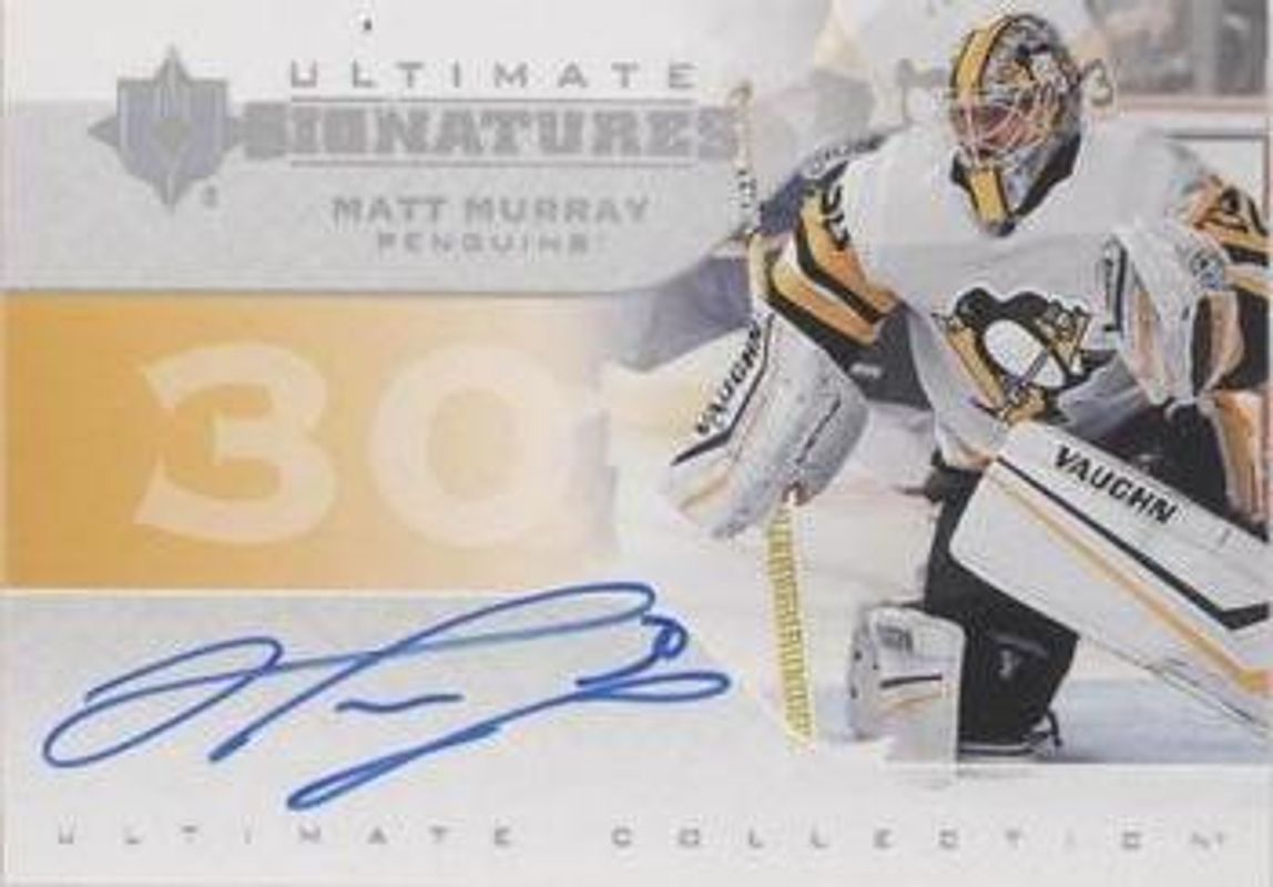The Matt Murray 2020 Upper Deck Ultimate Collection #US-MM 2019 Upper Deck Ultimate Collection Update: Ultimate Signatures card is 1 of 12 Matt Murray's card variations in the 2020 Upper Deck Ultimate Collection set being tracked by Sports Card Investor, including Base /299, Gold /35, Onyx Black /5, 2019 Upper Deck Ultimate Collection Update: Autographs, and 2019 Upper Deck Ultimate Collection Update /299.