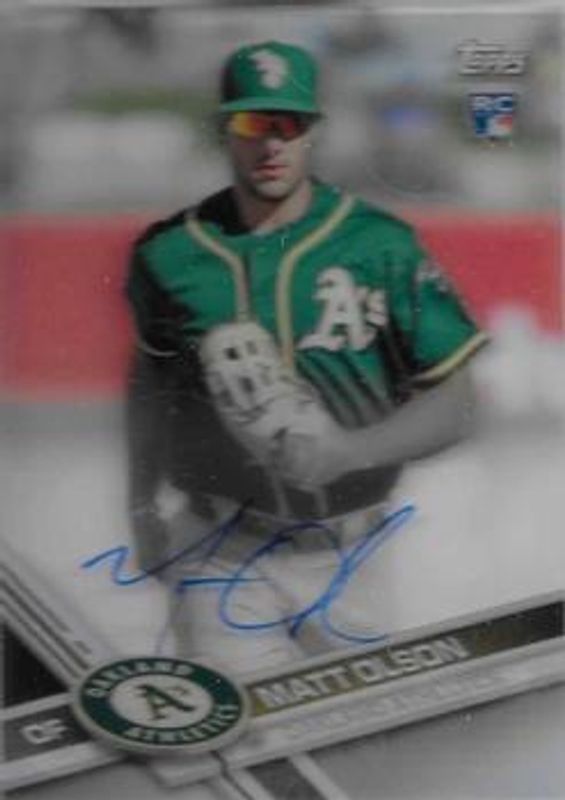 The Matt Olson 2017 Clearly Authentic #CAAU-MO Base Rookie card is 1 of 5 Matt Olson's card variations in the 2017 Clearly Authentic set being tracked by Sports Card Investor, including Green /99, Red /50, Blue /25, and Gold /1.