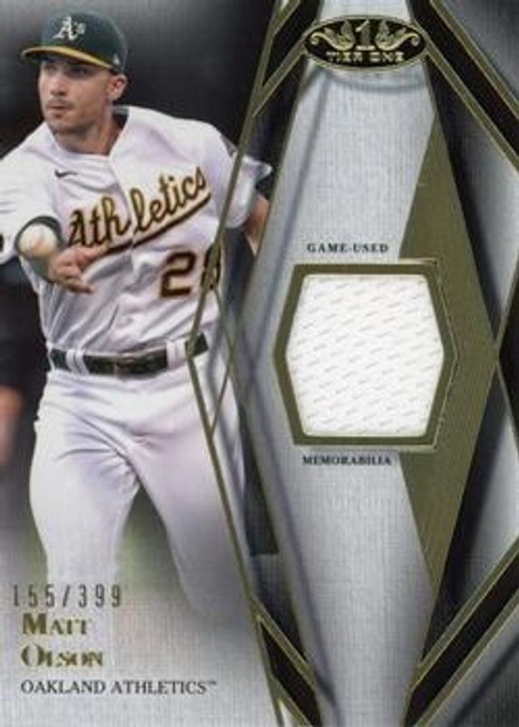 The Matt Olson 2022 Topps Tier One #T1R-MO Relics Design A /249 card is 1 of 24 Matt Olson's card variations in the 2022 Topps Tier One set being tracked by Sports Card Investor, including Prime Performers Autographs /125, Autographed Relics /49, Autographed Relics Dual - Patch /25, Prime Performers Autographs - Bronze Ink /25, and Relics Dual - Patch /25.
