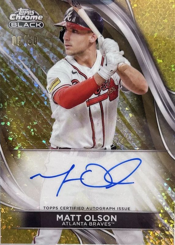 The Matt Olson 2024 Topps Chrome Black #CBA-MO Autographs - Gold Mini-Diamond Refractor /50 card in Raw condition has not changed in price in the last 30 days and was last sold for $57.74 .