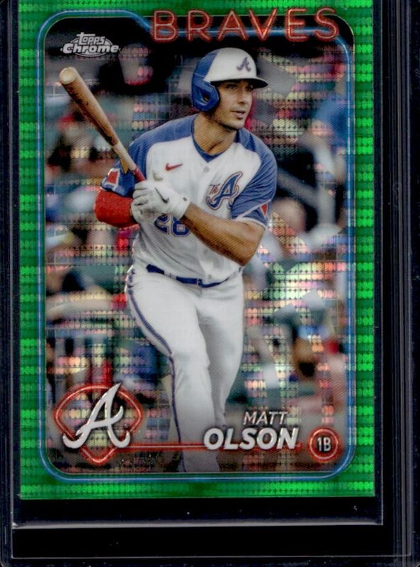 The Matt Olson 2024 Topps Chrome #23 Green Sonar Refractor /99 card is 1 of 34 Matt Olson's card variations in the 2024 Topps Chrome set being tracked by Sports Card Investor, including Base, Pink Refractor, Prism Refractor, X Fractor, and Aqua Lava Refractor /199.