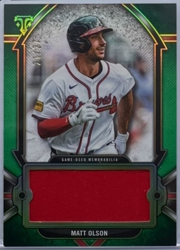 The Matt Olson 2024 Topps Triple Threads #SJR-MO2 Single Jumbo Relics - Emerald /27 card is 1 of 89 Matt Olson's card variations in the 2024 Topps Triple Threads set being tracked by Sports Card Investor, including Base, Amber /199, Aquamarine /149, Tourmaline /125, and Gold /99.