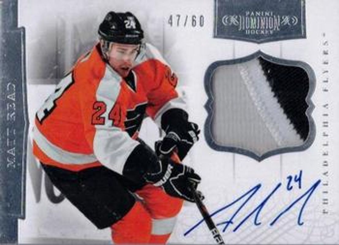 The Matt Read 2011 Dominion #71 Autographed Patches /60 Rookie card is 1 of 26 Matt Read's card variations in the 2011 Dominion set being tracked by Sports Card Investor, including Base /199, Gold /25, Emerald /5, Black /1, and Printing Plates Black /1.