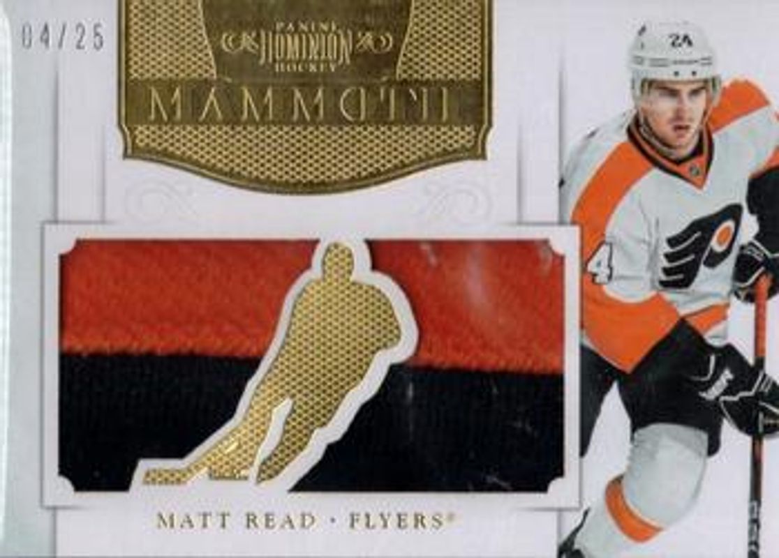 The Matt Read 2011 Dominion #35 Mammoth Jerseys Prime /25 Rookie card is 1 of 26 Matt Read's card variations in the 2011 Dominion set being tracked by Sports Card Investor, including Base /199, Gold /25, Emerald /5, Black /1, and Printing Plates Black /1.