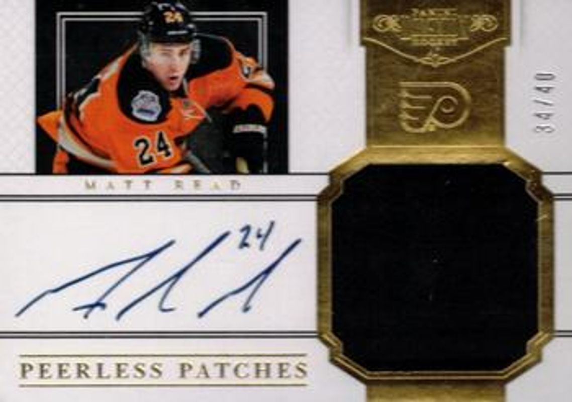 The Matt Read 2011 Dominion #71 Peerless Patches Autographs /40 Rookie card is 1 of 26 Matt Read's card variations in the 2011 Dominion set being tracked by Sports Card Investor, including Base /199, Gold /25, Emerald /5, Black /1, and Printing Plates Black /1.