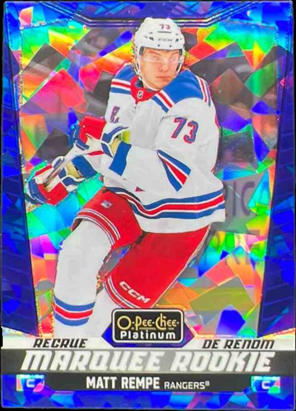 The Matt Rempe 2024 O-Pee-Chee Platinum #244 Blue Fragments /125 Rookie card is 1 of 33 Matt Rempe's card variations in the 2024 O-Pee-Chee Platinum set being tracked by Sports Card Investor, including Base, Neon Yellow Surge, Pink Magma, Rainbow, and Sunset.