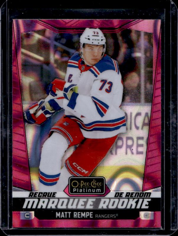 The Matt Rempe 2024 O-Pee-Chee Platinum #244 Pink Magma Rookie card is 1 of 33 Matt Rempe's card variations in the 2024 O-Pee-Chee Platinum set being tracked by Sports Card Investor, including Base, Neon Yellow Surge, Rainbow, Sunset, and Violet Pixels /299.