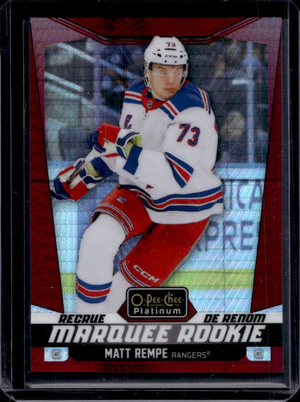 The Matt Rempe 2024 O-Pee-Chee Platinum #244 Red Prism /199 Rookie card is 1 of 33 Matt Rempe's card variations in the 2024 O-Pee-Chee Platinum set being tracked by Sports Card Investor, including Base, Neon Yellow Surge, Pink Magma, Rainbow, and Sunset.