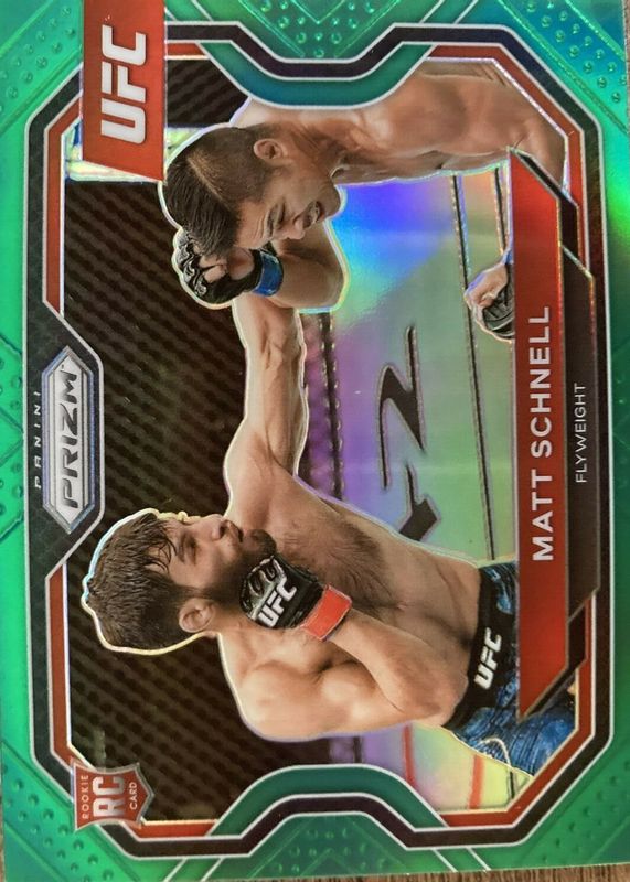 The Matt Schnell 2021 Prizm UFC #109 Green Rookie card in Raw condition has not changed in price in the last 30 days and was last sold for $6.99 .
