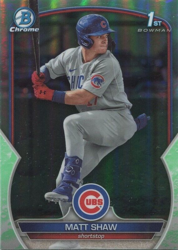 The Matt Shaw 2023 Bowman Draft #BDC-33 Chrome - Lunar Glow Refractor (1st) card in Raw condition has not changed in price in the last 30 days and was last sold for $8.00 .