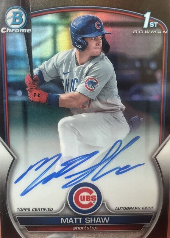 Best Prices Available For Sale of Matt Shaw 2023 Bowman Draft #CDA-MS Chrome Prospect Auto - Black Refractor /75 (1st)