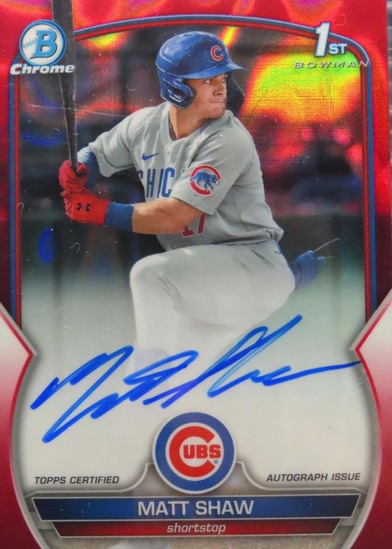 Auctions Ending Soon for Matt Shaw 2023 Bowman Draft #CDA-MS Chrome Prospect Auto - Red Lava Refractor /5 (1st) RAW