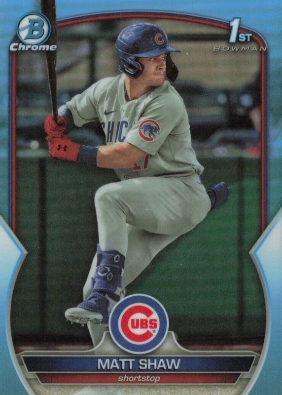 The Matt Shaw 2023 Bowman Draft #BDC-33 Chrome - Sky Blue Refractor (1st) card in Raw condition has not changed in price in the last 30 days and was last sold for $14.00 .