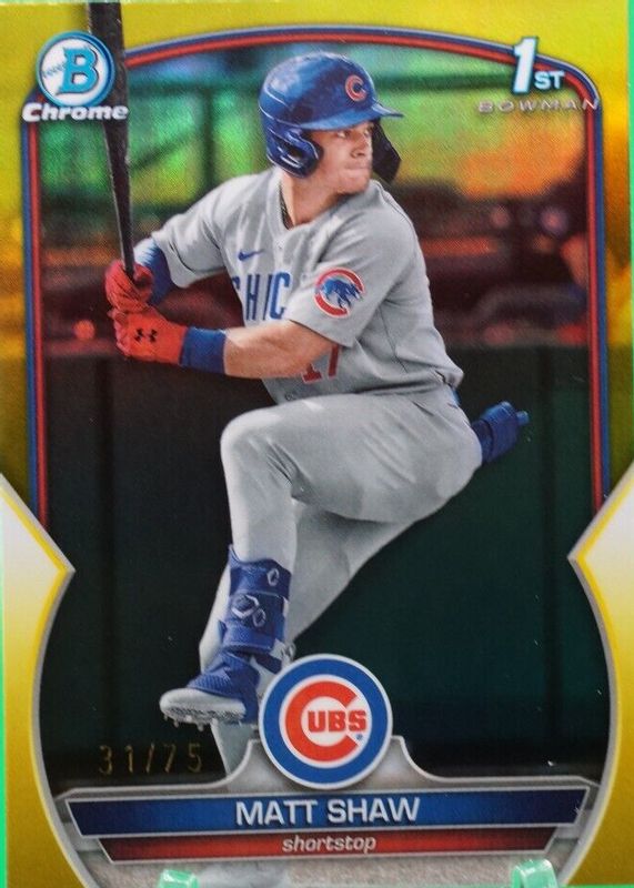 The Matt Shaw 2023 Bowman Draft #BDC-33 Chrome - Yellow Refractor /75 (1st) card in Raw condition has not changed in price in the last 30 days and was last sold for $22.27 .