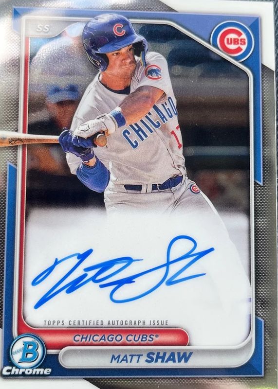 The Matt Shaw 2024 Bowman #CPA-MS Chrome Prospect Auto card in Raw condition has not changed in price in the last 30 days and was last sold for $9.01 .