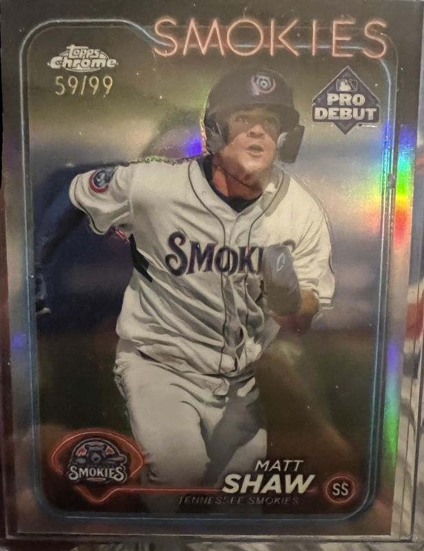 The Matt Shaw 2024 Topps Pro Debut #PDC-133 Chrome - Refractor /99 card is 1 of 37 Matt Shaw's card variations in the 2024 Topps Pro Debut set being tracked by Sports Card Investor, including Base, Fuchsia Foil /199, Sparkle Foil /175, Blue Foil /150, and Green Foil /99.