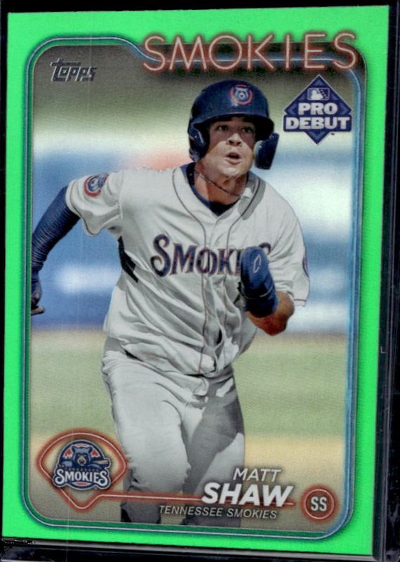 The Matt Shaw 2024 Topps Pro Debut #PD-133 Green Foil /99 card is 1 of 37 Matt Shaw's card variations in the 2024 Topps Pro Debut set being tracked by Sports Card Investor, including Base, Fuchsia Foil /199, Sparkle Foil /175, Blue Foil /150, and Aqua Foil /75.