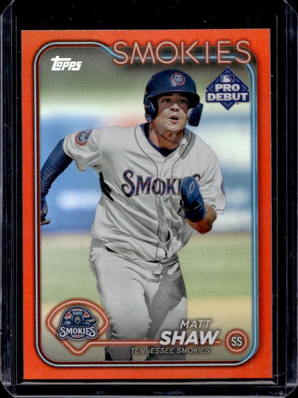 The Matt Shaw 2024 Topps Pro Debut #PD-133 Orange Foil /25 card is 1 of 37 Matt Shaw's card variations in the 2024 Topps Pro Debut set being tracked by Sports Card Investor, including Base, Fuchsia Foil /199, Sparkle Foil /175, Blue Foil /150, and Green Foil /99.