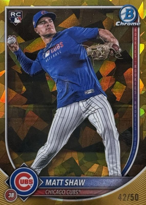 The Matt Shaw 2025 Bowman Chrome Sapphire Edition #46 Image Variation - Gold /50 Rookie card in Raw condition has not changed in price in the last 30 days and was last sold for $50.00 .