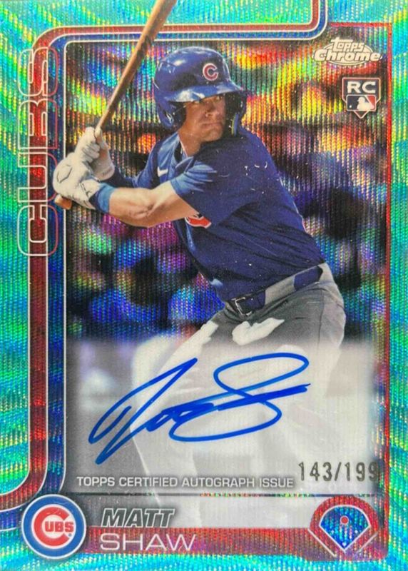2025 Topps Chrome Matt Shaw On Card True RC Rookie Aqua Wave Auto /199 Cubs