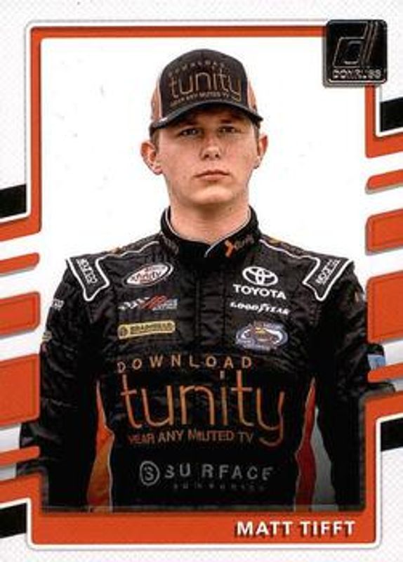 The Matt Tifft 2018 Donruss NASCAR #80 Base card is 1 of 17 Matt Tifft's card variations in the 2018 Donruss NASCAR set being tracked by Sports Card Investor, including Gold Foil /499, Red Foil /299, Green Foil /199, Press Proof Gold /99, and Press Proof Holofoil /49.