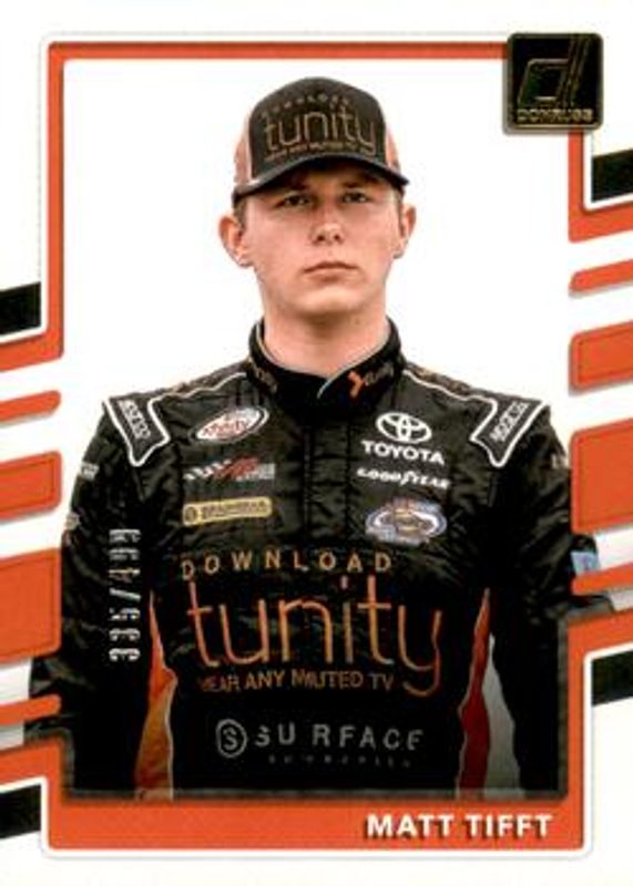 The Matt Tifft 2018 Donruss NASCAR #80 Gold Foil /499 card is 1 of 17 Matt Tifft's card variations in the 2018 Donruss NASCAR set being tracked by Sports Card Investor, including Base, Red Foil /299, Green Foil /199, Press Proof Gold /99, and Press Proof Holofoil /49.