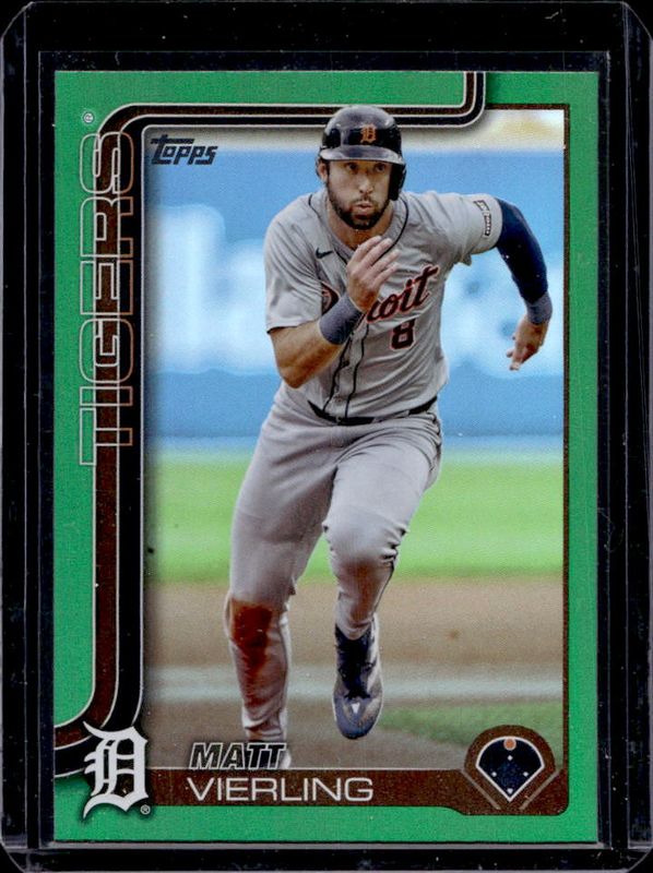 The Matt Vierling 2025 Topps #166 Green Rainbow /99 card is 1 of 62 Matt Vierling's card variations in the 2025 Topps set being tracked by Sports Card Investor, including Base, Aqua Holo Foil, Diamante Foil, Holo Foil, and Pink Diamante Foil.