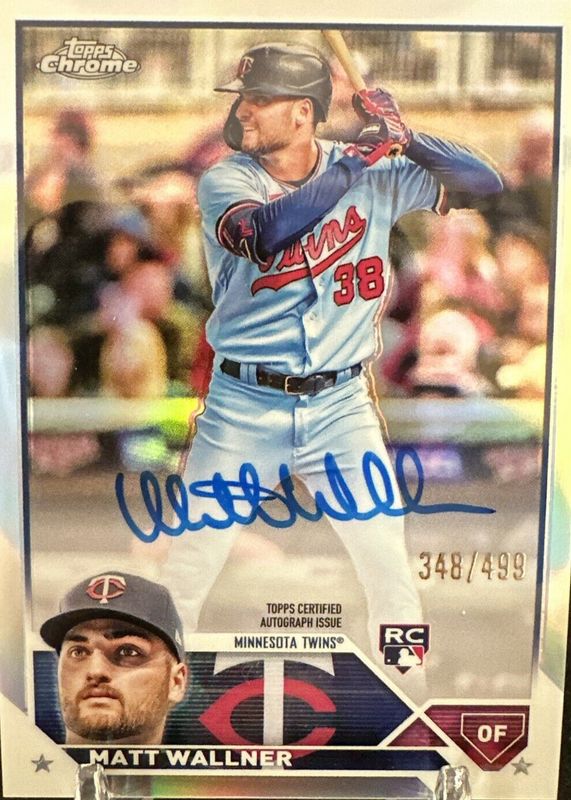 This card is 1 of 16 Matt Wallner's card variations in the 2023 Topps Chrome set being tracked by Sports Card Investor, including Rookie Autographs, Rookie Autographs - Black & White Mini-Diamond Refractor, Rookie Autographs - Purple Speckle Refractor /299, Rookie Autographs - Purple Refractor /250, and Rookie Autographs - Aqua Wave Refractor /199.