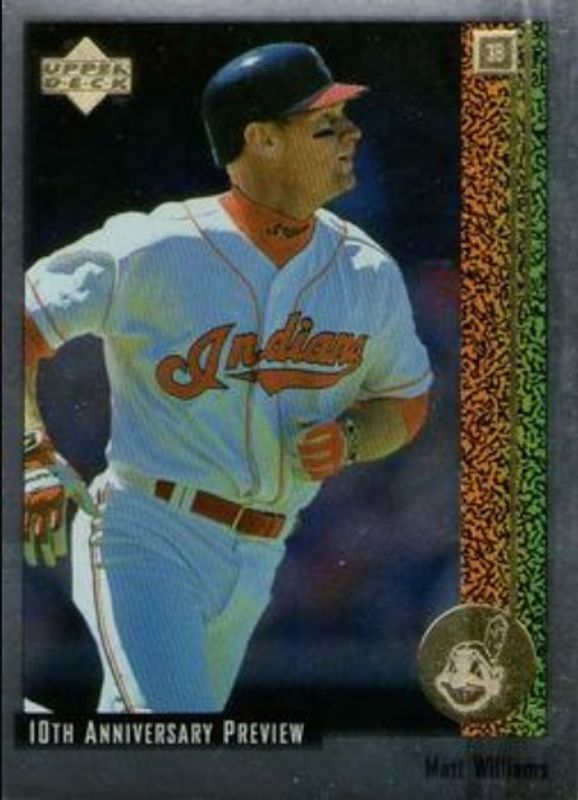 The Matt Williams 1998 Upper Deck #33 10th Anniversary Preview card is 1 of 5 Matt Williams' card variations in the 1998 Upper Deck set being tracked by Sports Card Investor, including Base, 10th Anniversary Preview Edition Retail, Tape Measure Titans, and Tape Measure Titans Gold /2667.