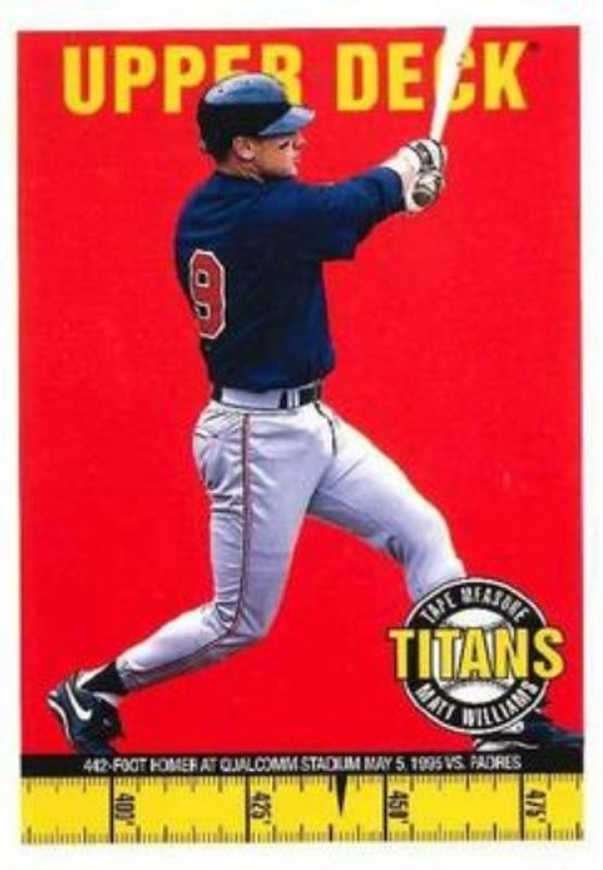 The Matt Williams 1998 Upper Deck #25 Tape Measure Titans card is 1 of 5 Matt Williams' card variations in the 1998 Upper Deck set being tracked by Sports Card Investor, including Base, 10th Anniversary Preview, 10th Anniversary Preview Edition Retail, and Tape Measure Titans Gold /2667.